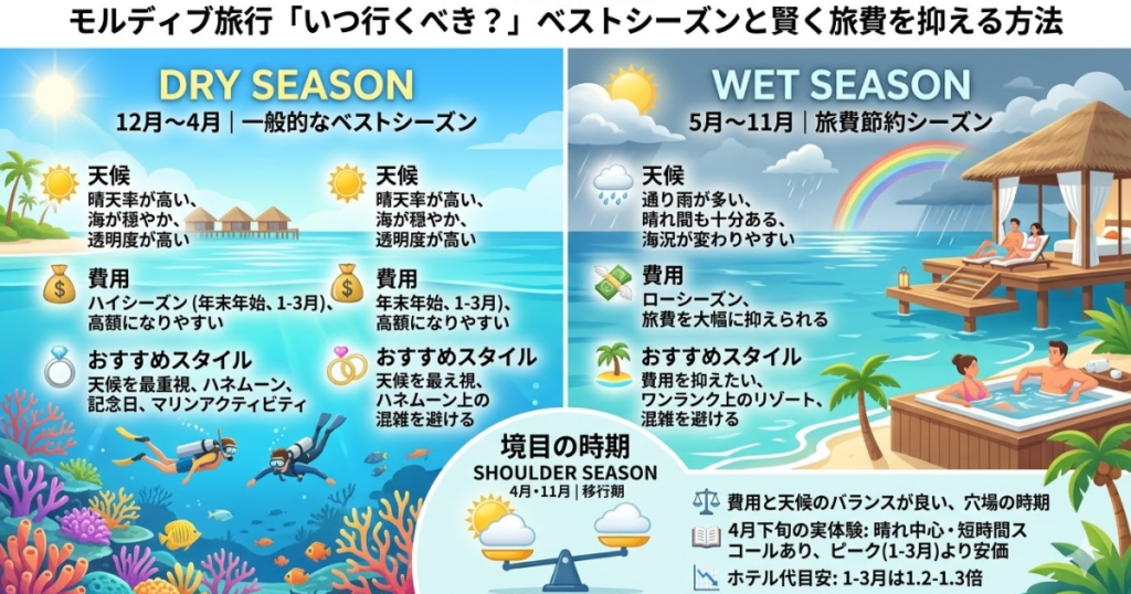 (※モルディブ自体は年間を通して気温が高く、熱帯気候のため大きく季節の差が出ない一方で、乾季と雨季の区分があるので、事前に気候の特徴を押さえておくと計画が立てやすくなります。)