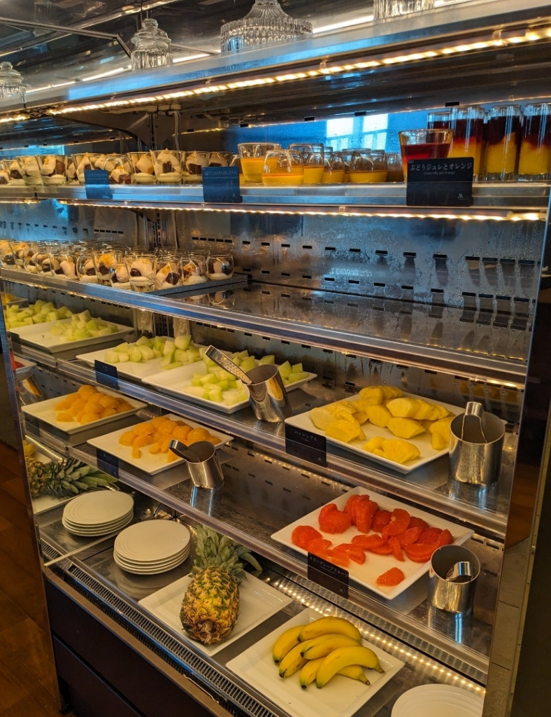 クラブラウンジの朝食では、パンやペストリー、フルーツ、シリアルなどの基本的なアイテムに加えて、和洋の小皿料理やサラダ類が並んでいました。