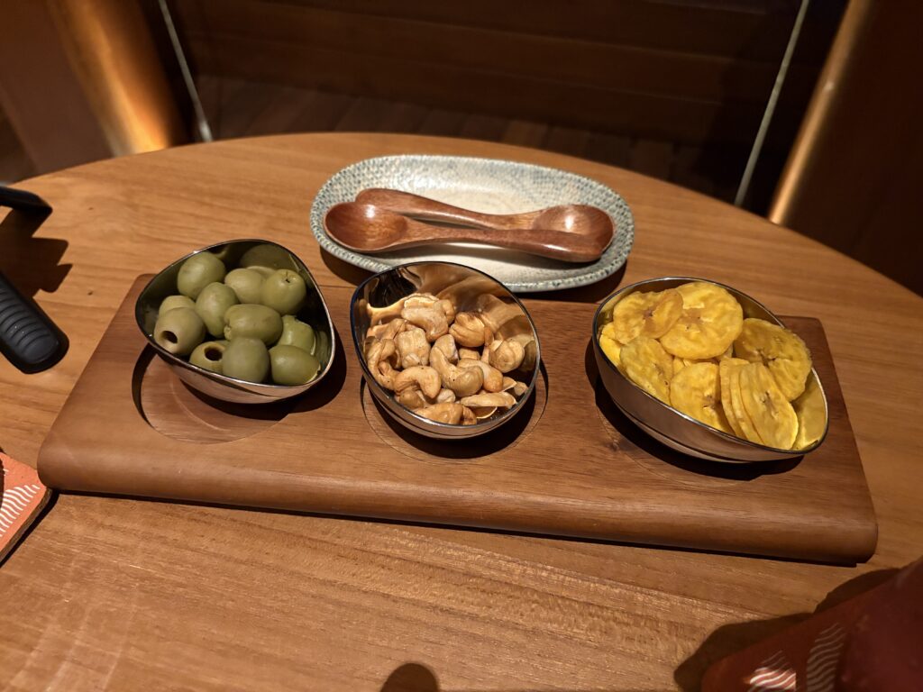 オリーブ、ナッツ、バナナチップスの盛り合わせで、これが地味に嬉しいです。