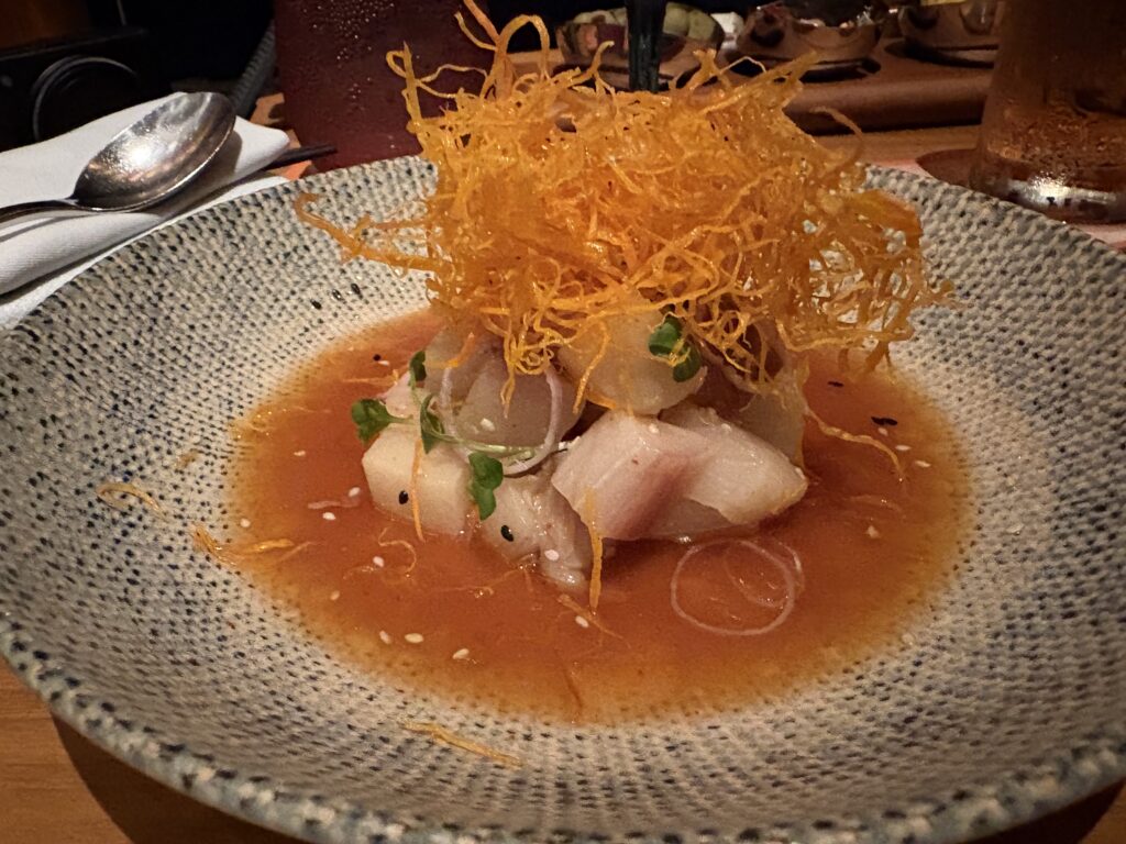 セビーチェは異国を感じるものの、刺身をベースに、柑橘の酸味とハーブが効いていて、とにかくさっぱりしている一皿です。
