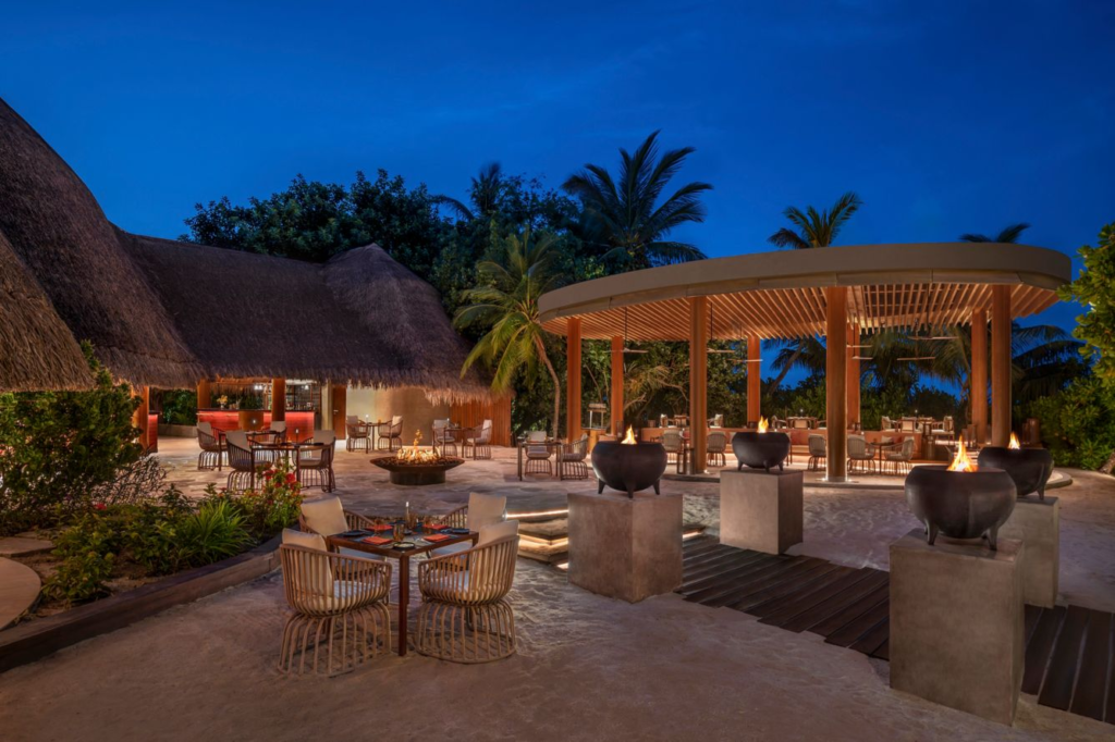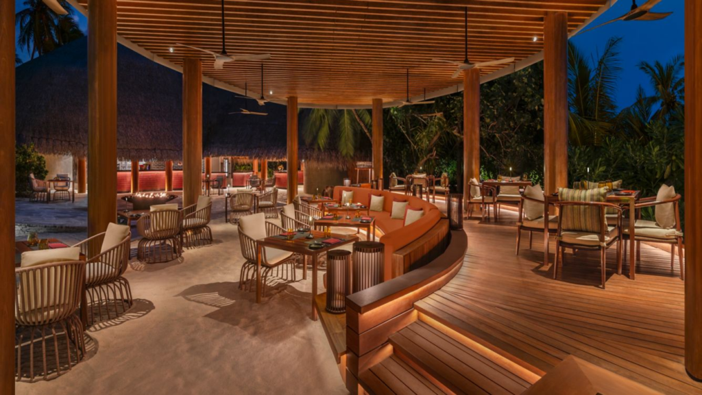 FIREはWモルディブのビーチサイドにあるディナー専用レストランで、テーブルが並ぶ開放的な空間です。