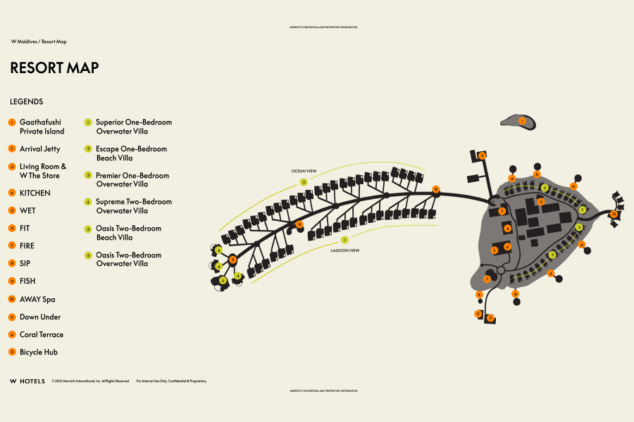 Wモルディブで代表的な飲食施設の位置関係